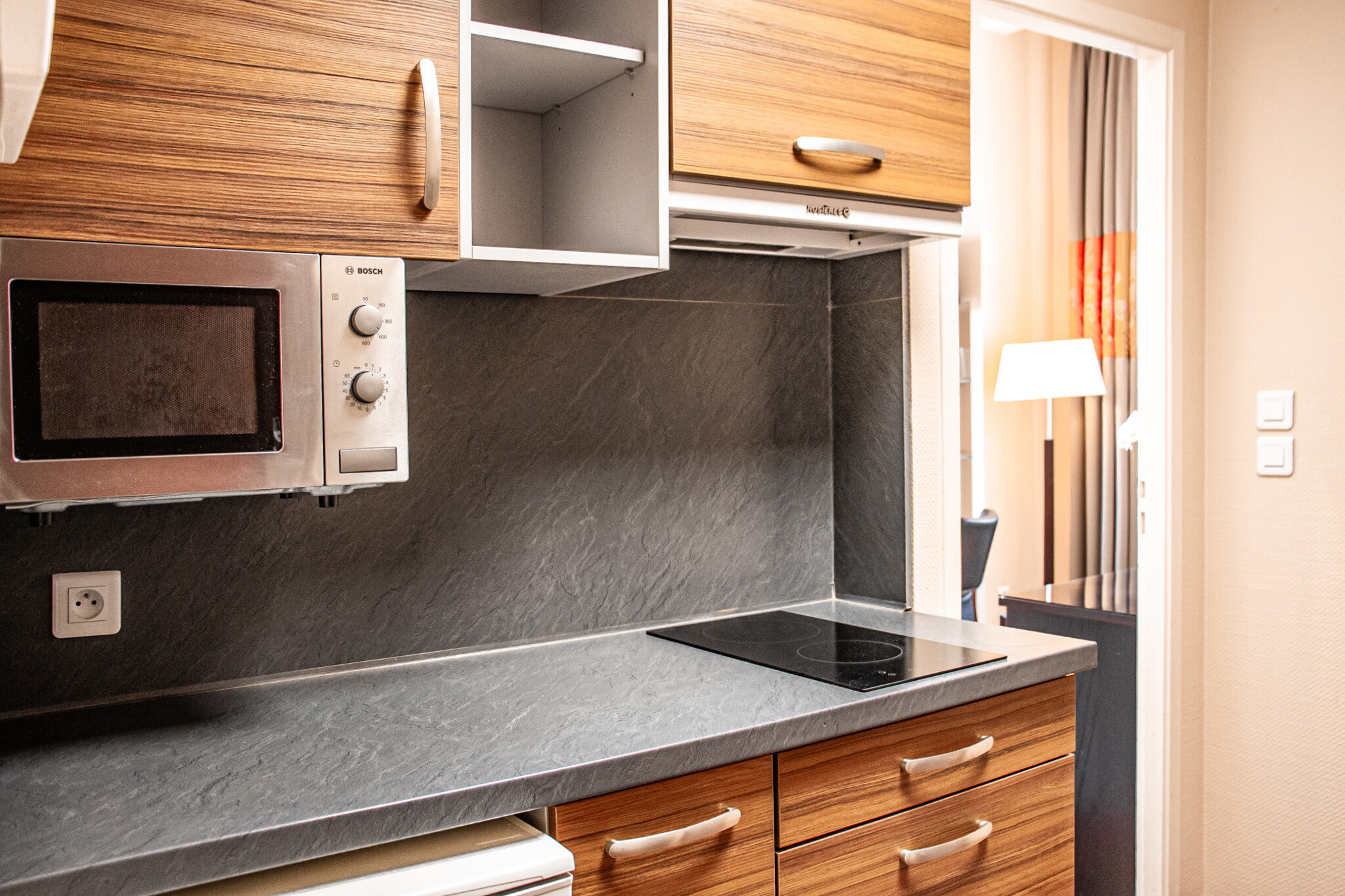 La residencia cuenta con 64 estudios y apartamentos amplios, completamente amueblados y equipados, ofreciendo una estancia cómoda e independiente. Cada alojamiento dispone de una kitchenette completa, un televisor de pantalla plana y un baño privado. Para hacer su estancia aún más agradable, disfrute cada mañana de un desayuno buffet, relájese en el acogedor bar, explore la biblioteca o diviértase en la sala de juegos.